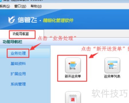 2、 登录系统后,进入功能导航栏,选择业务处理下的新开送货单,进入送货单填写页面。输入客户信息及商品明细后,点击确认开单按钮,即可完成并保存送货单。