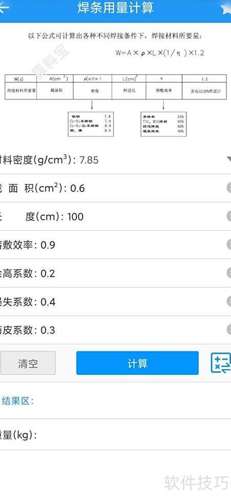 3、 进入计算页面,输入焊条参数即可得出所需用量。