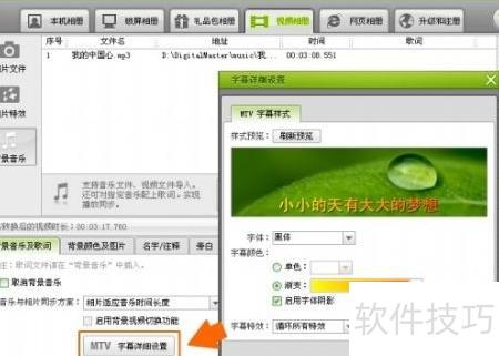 4、 接下来可为视频添加悦耳的背景音乐。进入背景音乐选项卡,即可导入音乐并同步加载LRC歌词。通过点击MTV字幕详细设置,还能对歌词字幕的显示效果进行个性化调整,打造富有节奏感的动态MTV字幕,让视频在细节呈现上更显炫酷与动感。