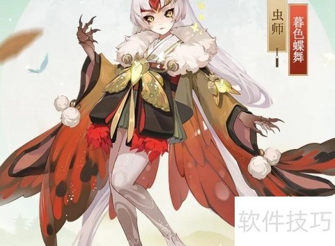 3、 暮色降临,蝶影翩跹,阴阳师虫师身披新裳,翅翼轻扬,染尽霞光余晖。林间舞步不息,直至最后一缕光线消散。胸前饰物精雕细琢,束起柔滑披肩,飘带随风轻拂,薄袖如蝉翼舒展,其上蝶纹斑斓绚丽,宛如活蝶栖于衣袂之间,流光溢彩,美不胜收。