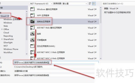 2、 创建控制台应用,命名为使用Parse()方法转换数据类型,点击确定完成设置。