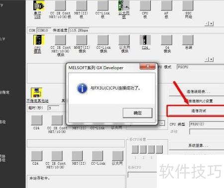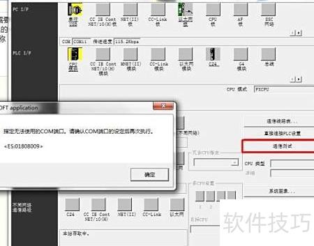 7、 完成参数设置后,点击通信测试按钮。若参数有误,系统将提示检查COM端口;若设置无误,则显示与PLC连接成功的信息。