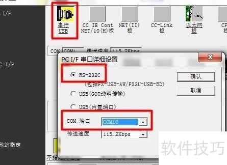 5、 系统将弹出对话框。要连接PLC,需确认所插入USB对应的COM端口号。接着点击,在新窗口中选择RS-232C通信方式,并在COM端口项中选中对应USB接口的端口名称。若不确定具体端口,可从COM1开始逐个尝试。传输速率保持默认设置即可完成配置。