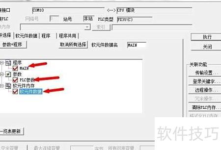 9、 点击后,进入软件前会弹出对话框,若PLC内有程序,请务必勾选三个选项中的红色对勾,再点击执行。