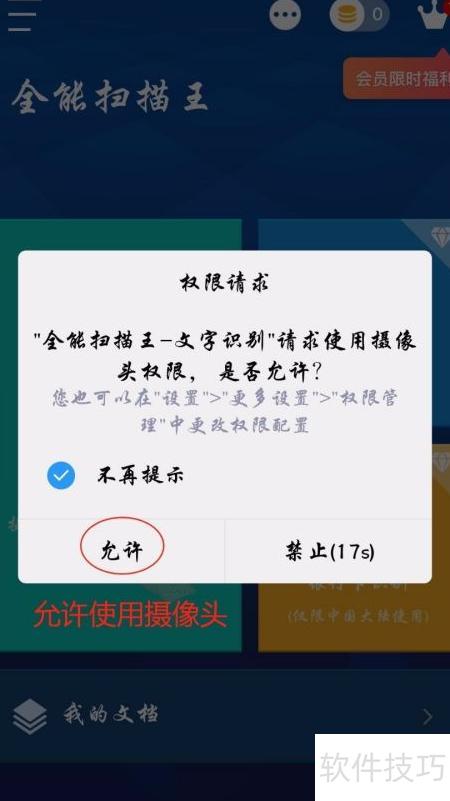 4、 点击后,系统将提示软件申请摄像头权限,请点击允许。