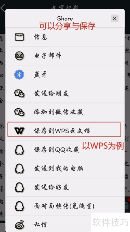 8、 可将导出的文件分享或存于手机,本例展示保存至WPS云文档的操作过程。