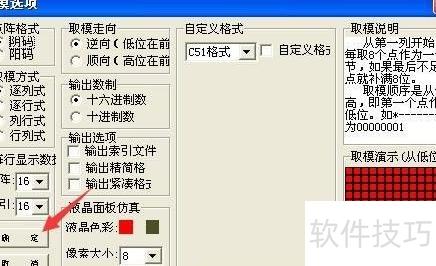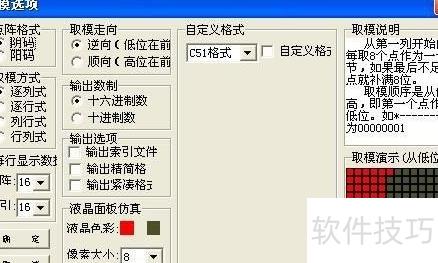3、 通过调整设置中的各项参数,可自定义输出格式,如选择二进制或十六进制转换,以及设定按行或按列进行取模运算等。