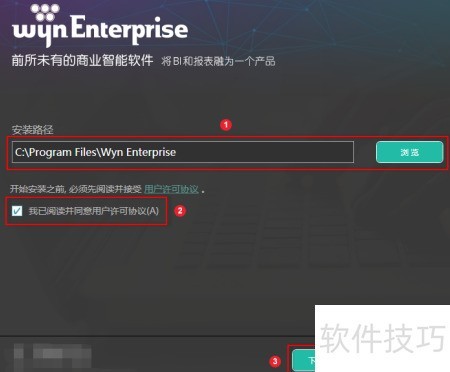 2、 选择安装位置,可使用默认路径或点击浏览自定义,勾选同意用户许可协议,确认后点击下一步继续操作。