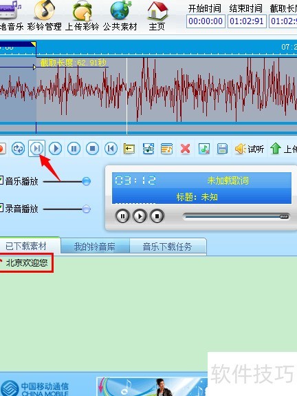 7、 双击歌曲后会出现分段音频,点击从头播放,逐步听到需要截取的位置。