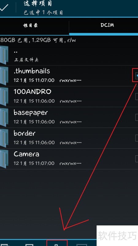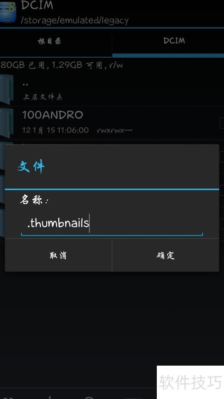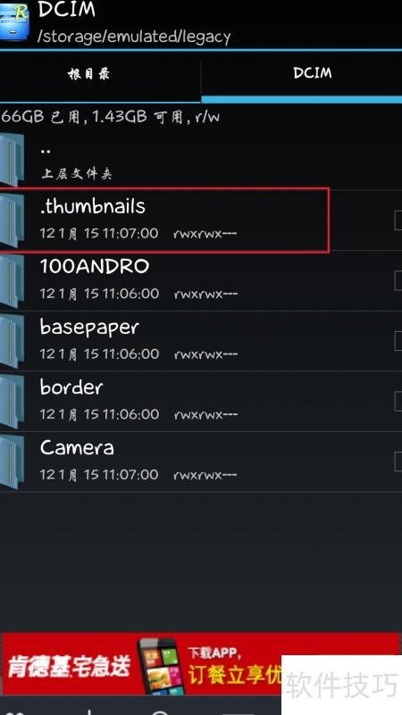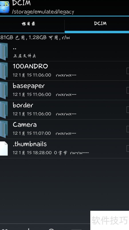 4、 进入DCIM目录,发现其中包含一个名为.thumbnails的隐藏文件夹。