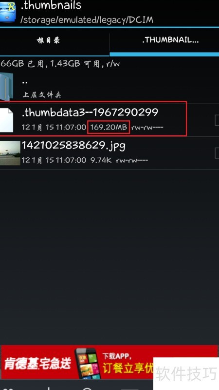 5、 进入.thumbnails文件夹,发现其中有一个名为.thumbdata3--1967290299的文件,这正是系统生成的缩略图缓存,当前大小为169.2MB。由于手机中存储的照片数量较少,因此该缓存文件体积并不大。