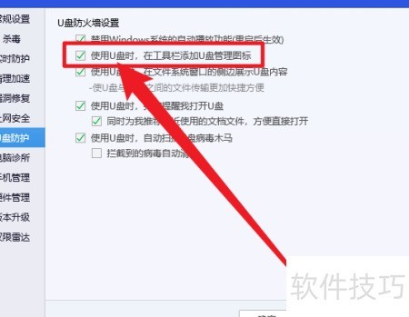 2、 在U盘防护设置中,勾选在工具栏添加U盘管理图标即可完成配置。