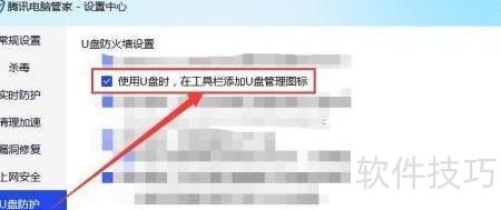 6、 ,在U盘防护界面的U盘防火墙设置中,勾选使用U盘时在工具栏添加管理图标即可完成设置。