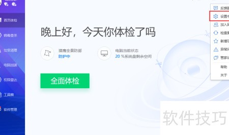 2、 点击电脑管家右上角的三图标,选择设置中心,进入设置界面进行相关配置。