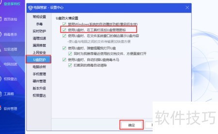 3、 在左侧菜单中找到U盘防护功能,进入右侧的U盘防火墙设置区域,勾选使用U盘时,在工具栏添加U盘管理图标选项,确认无误后点击确定按钮,即可完成该功能的启用,使U盘插入时工具栏自动显示管理图标,方便快捷操作与安全管控。