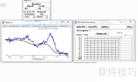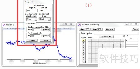 1、 在获得所示的分析结果后,接下来需进行分峰处理。图中共有两个峰,优先对后一个峰进行分解。具体操作(1)所示:首先为能谱添加背底线,进入工具栏点击background,弹出boundary设置窗口。其中,High BE与Low BE两项由软件根据能谱数据自动设定,通常建议保持默认值,不宜随意更改,以确保后续分析的准确性与可靠性。