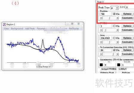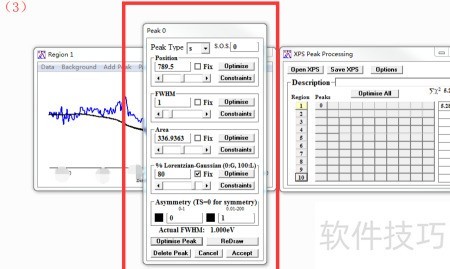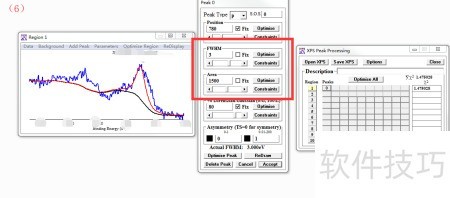 3、 保持其他参数不变,点击确认即可获得(5)所示结果。接下来需对峰高和峰宽进行拟合,具体操作所示:调整半高宽(FWHM)及峰面积(area)等参数,参考图(6)所示过程。至此,分峰拟合基本完成。后续的数据处理方法将在XPS数据处理与XPSpeak41软件使用(3)中详细说明。