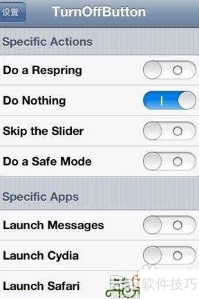 2、 Do a Respring表示重启桌面,相当于刷新主界面;Do Nothing表示不执行任何操作,此选项功能不明显,开启或关闭均无显著影响;Skip the Slider可跳过滑动关机步骤,实现直接关机;Do a Safe Mode用于进入安全模式,便于排查问题;Specific Apps指通过Power按钮启动指定应用程序,方便快捷访问常用功能。