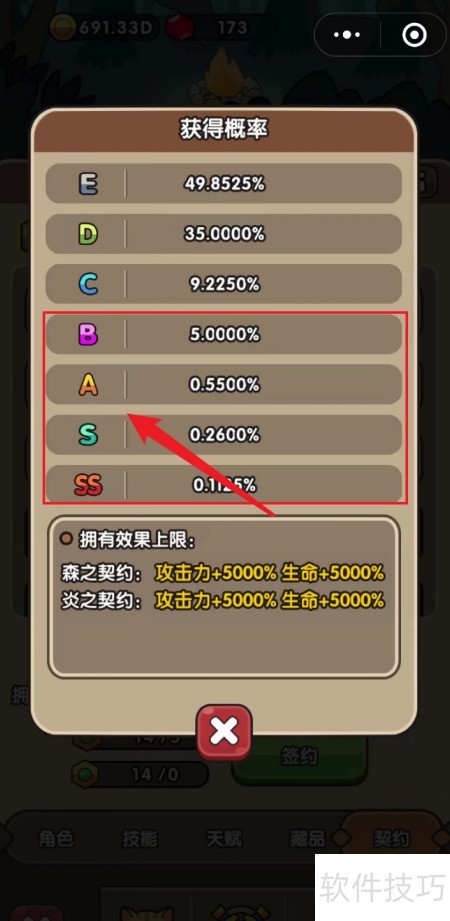 2、 进入游戏后查看主角界面,点击契约可查看等级与获取概率,完成签约后应优先选择高等级属性进行培养。