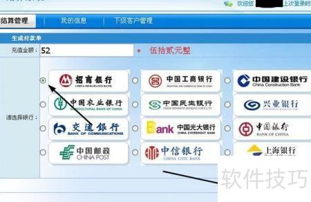 3、 进入支付页面后,输入付款金额(如52元),选择支付银行,点击下一步,系统将自动跳转至所选银行的网上银行支付界面完成后续操作。