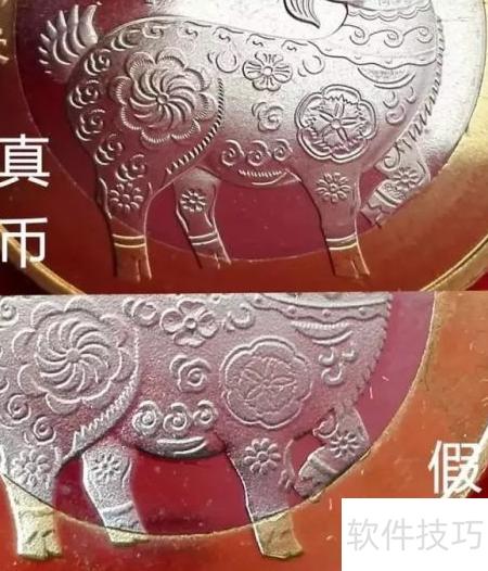 2、 真币表面平整,图案清晰,前羊腿处藏有RMB暗记。