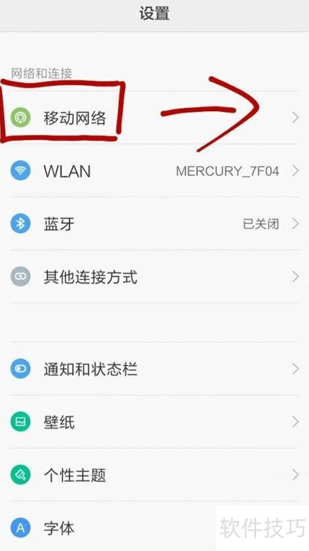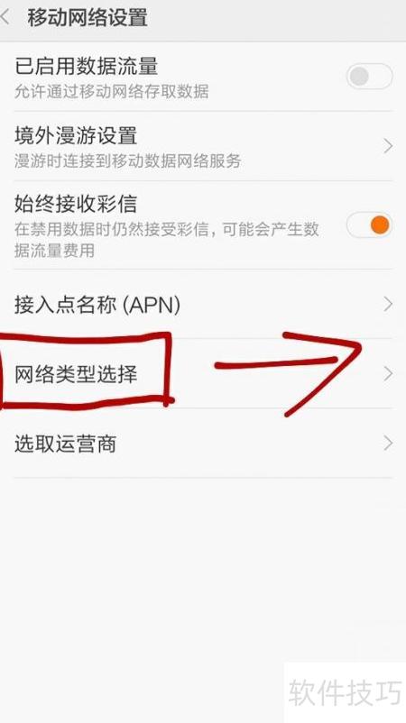 1、 进入移动网络设置,找到网络类型选项并点击进入下一界面。
