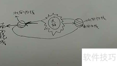 3、 在轨道远日点处绘制地球,标出赤道及南北回归线。此时阳光直射北回归线,北半球进入夏季。地球绕太阳运行一周,完成从冬到夏的循环,开启新的周期。