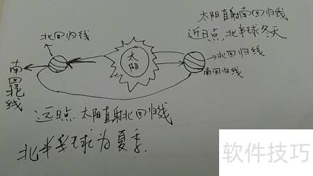 先画一个火红的太阳,再在靠近太阳的位置画地球,并标出赤道和南北回归线。当地球处于近日点时,太阳直射南回归线,此时北半球为冬季,南半球则进入夏季。