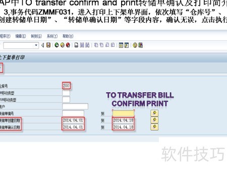 3、 输入事务代码ZMMF031,进入上下架单打印界面,依次填写仓库号、创建转储单日期、转储单确认日期等信息,核对无误后点击执行按钮。