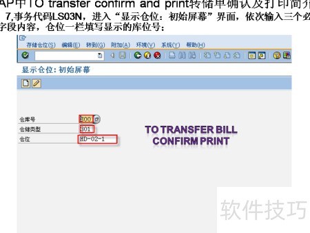 7、 在事务代码LS03N中进入显示仓位:初始屏幕,依次填写三个必填项,其中仓位栏输入对应的库位编号。