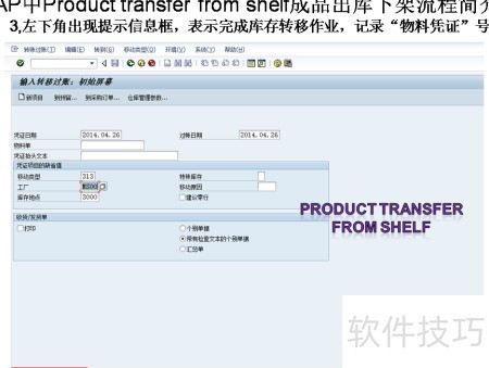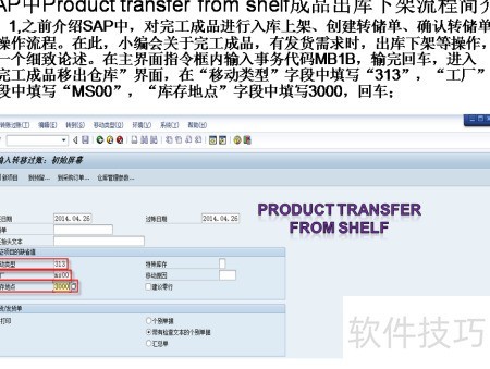 1、 在主界面的命令框中输入事务代码MB1B,按回车键进入完工成品移出仓库页面。在移动类型栏输入313,工厂栏输入MS00,库存地点栏输入3000,随后按下回车确认操作。