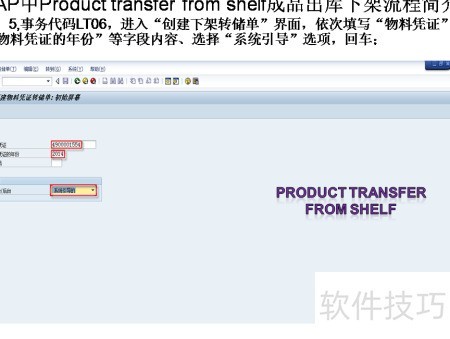 5、 输入事务代码LT06,进入创建下架转储单界面,依次填写物料凭证、年份等信息,选择系统引导并回车确认。