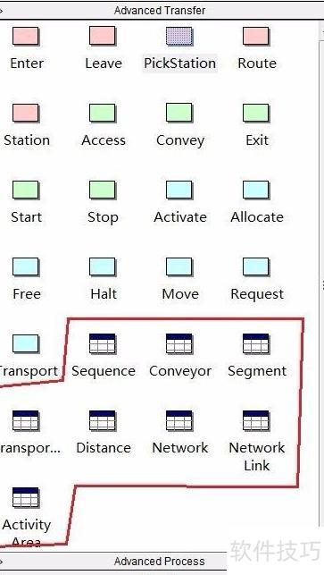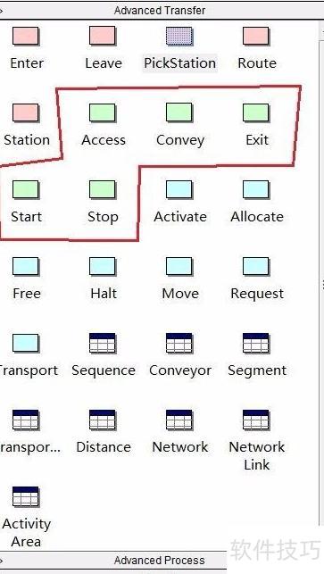 11、 接下来是绿色功能模块,主要用于设置和调整传送带运行模式的各项参数。该模块由Access与Convey组合构成,其中Access作为传送带的入口起点,Exit则作为出口终点。Start与Stop按钮分别用于控制传送带的启动与暂停,便于模拟运行中断或故障等场景。在使用传送带模式时,必须在Access模块前连接一个起始站点(Station),并在Exit模块后接入一个终止站点(Station),以确保流程完整。此外,还需配置Conveyor图表模块和Segment图表模块,这两个模块用于设定传送带的具体属性,包括运行速度、整体长度、承载空间等关键参数,从而全面定义传送带的工作状态与物理特性。