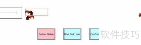 6、 当传送类型为Route时,需明确三个要素:起点位置、终点站台以及传输所需时间。与前一种方式相比,Route具备更高的灵活性,允许用户指定具体的终点Station。此外,可通过动画传输工具栏中的Route按钮对传输过程的动画效果进行编辑和调整。在完成设置后,Leave模块右侧的连接端口将自动隐藏,表明实体不再通过连线直接输出。此时,实体从Leave模块出发,依照预设的Route路径,前往指定的目的地站台,并在途中消耗相应的时间。同样,Route模块也具备类似的功能,支持基于路径的定向传输,实现更精确的流程控制和动态模拟效果。