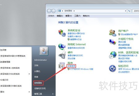 1、 在电脑桌面点击开始菜单,进入控制面板,找到并点击卸载程序选项。