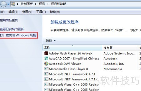 2、 在左侧窗口中找到并点击启用或关闭Windows功能选项。