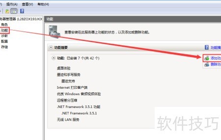 3、 在服务器管理器左侧选择管理,右侧找到并点击添加功能。