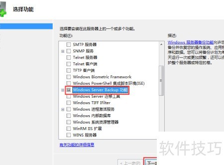 4、 在弹出的窗口中选择Windows Server Backup功能,随后点击下一步继续操作。