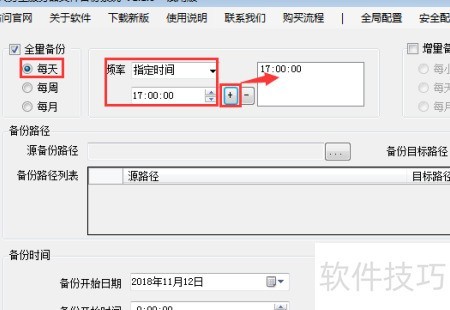 13、 在主界面首先选择全量备份,具体时间可根据需要自行设定。例如,若需每天下午17点执行备份,可勾选每天,在频率中选择指定时间,并于下方选取17点,点击加号将其添加至右侧窗口完成设置。