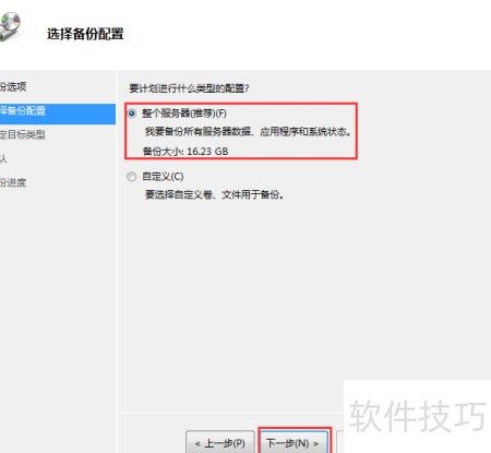 8、 在弹出的窗口中点击下一步,可根据需求选择完整备份服务器或仅备份指定文件。此处以整机备份为例,勾选整个服务器选项,确认无误后点击下一步继续操作。