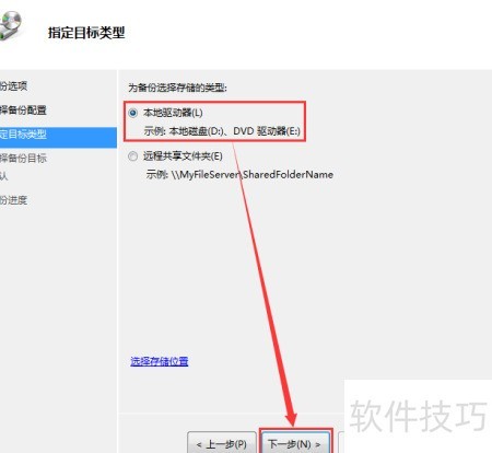 9、 此处需选择文件备份的位置,支持本地与远程两种方式。选择本地备份后,点击本地驱动器并进入下一步即可。