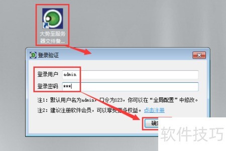 12、 安装完毕后,返回电脑桌面,找到系统快捷方式并双击打开。在登录界面按提示输入初始账号admin和密码123,确认即可进入系统。
