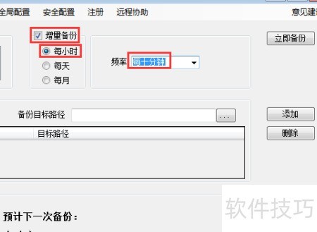 14、 建议选择增量备份,避免全量备份占用过多资源和时间。在下方设定备份周期,可设置为每十分钟执行一次。只需勾选每小时,并在右侧频率中选择每十分钟即可完成配置。
