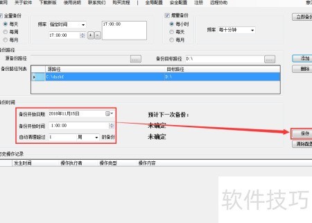 18、 在备份路径的大类中找到备份时间设置项,设定备份任务的起始日期与具体时间,比如2018年11月15日凌晨1点开始执行。完成时间配置后,在下方的自动清理备份选项中选择保留周期,避免长期备份导致磁盘空间不足。建议每周清理一次旧备份,设置完毕后点击保存按钮即可生效。