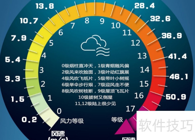 4、 风具有强度和方向两个特征,因此预报时需包含风速与风向。风速通常以风级表示,风级依据风对地表物体作用的明显程度划分,气象学上普遍将风力划分为十七个等级。