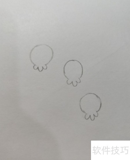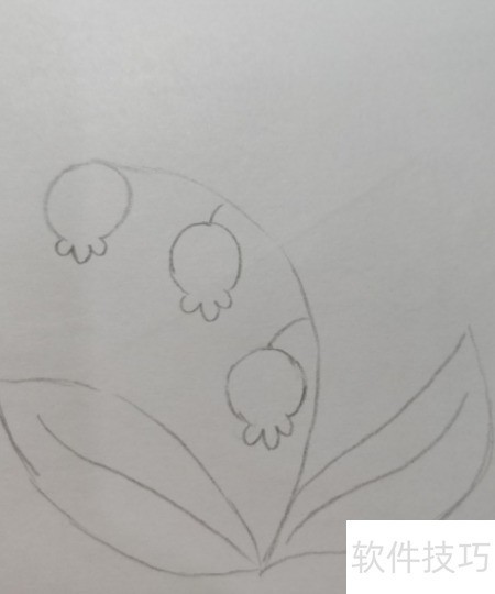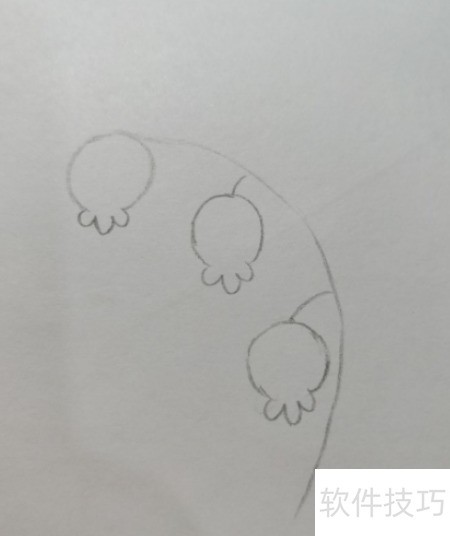 1、 先用笔在纸上画出三个形似小灯笼的铃兰花。