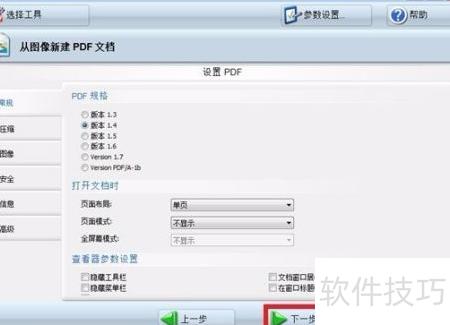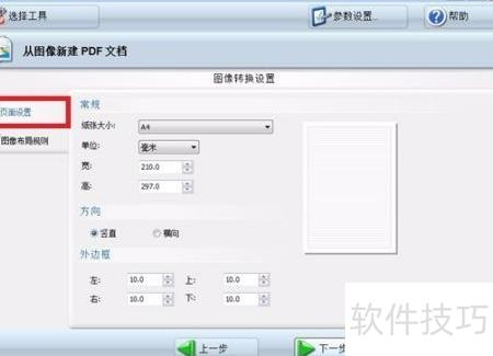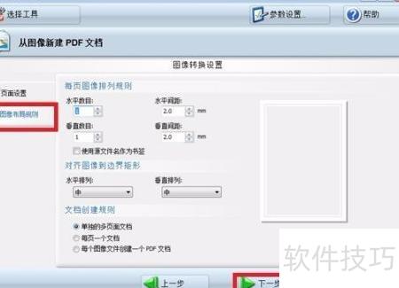 8、 在页面设置中可配置纸张尺寸与方向等参数,随后通过图像布局规则调整图片在文档中的排列方式。完成设置后,点击下一步继续操作。