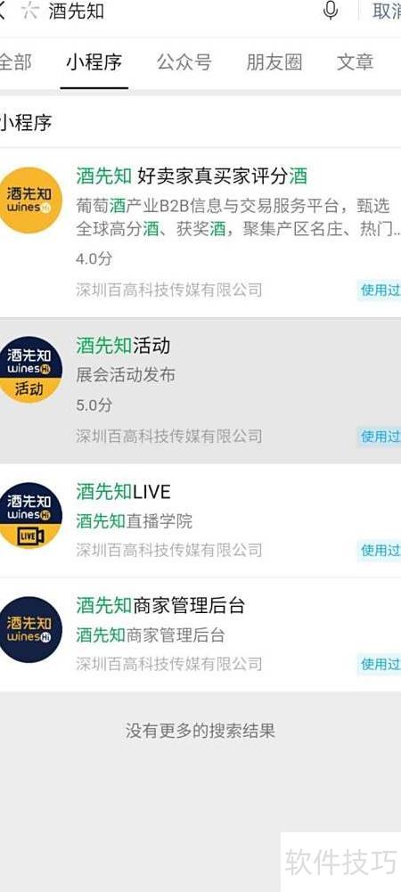 1、 打开微信,搜索酒先知,会显示四个相关小程序,均为酒先知旗下应用,点击第一个即可进入。