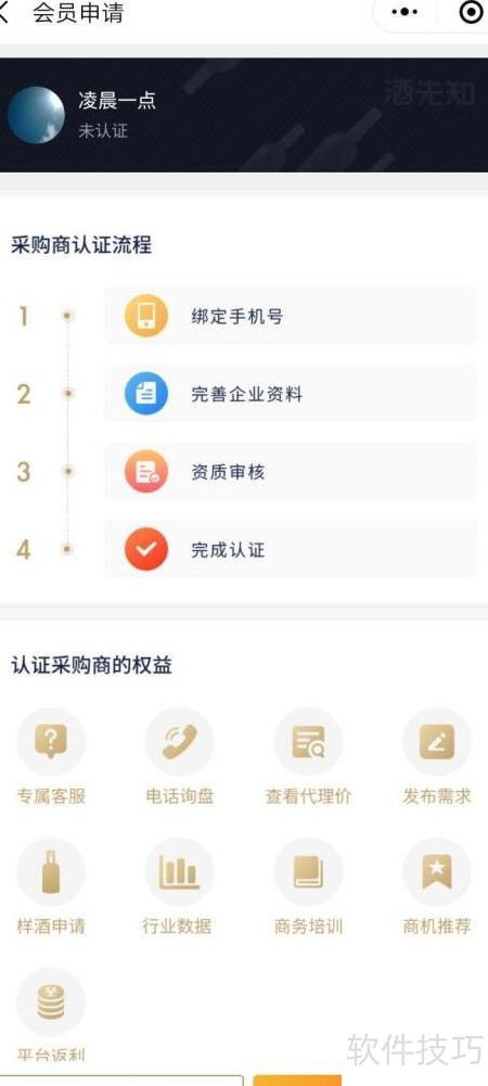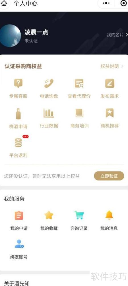 10、 酒先知个人中心可查看全部个人信息,仅认证为采购商后方可浏览小程序内完整采购价,未认证用户仅显示团购价格。