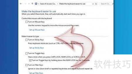 22、 可通过调整键盘操作方式来关闭Sticky Keys弹出提示,具体设置位于轻松访问中心菜单中的其他键盘选项里。